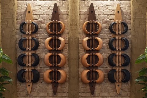 Tablica z hantlami SwingBell została wykonana z litego drewna i może pomieścić osiem hantli, czyli kompletny zestaw. 4 pary skórzanych hantli jest zawieszone na wspornikach z najwyższej jakości stali nierdzewnej. Uchwyty do hantli również zostały wykonane z litego drewna.
