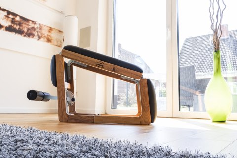 Rama ławki wykonana została z drewna orzechowego, w pozycji podstawowej TriaTrainer wymaga mniej niż jednego metra kwadratowego powierzchni. Elastyczny podnóżek można regulować w dziesięciu pozycjach.