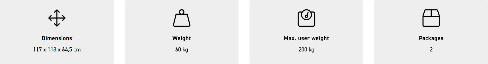 The bike was developed for a wide range of users with heights between 160 - 200 cm, so that everyone can enjoy a natural riding position, optimal weight distribution, and full spinal support even during longer training sessions.