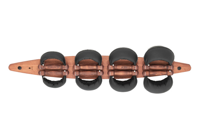 The SwingBell dumbbell plate is made of solid wood and holds eight dumbbells, a complete set. 4 pairs of leather dumbbells are suspended on brackets made of the highest quality stainless steel. The dumbbell handles are also made of solid wood.