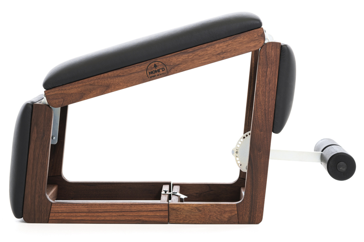 Rama ławki wykonana została z drewna orzechowego, w pozycji podstawowej TriaTrainer wymaga mniej niż jednego metra kwadratowego powierzchni. Elastyczny podnóżek można regulować w dziesięciu pozycjach.